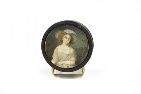 3417. Miniature en écaille avec miniature d'une femme au chapeau