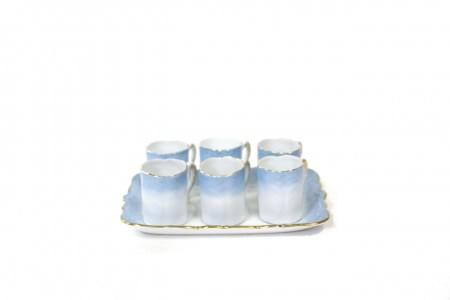 3421. 6 tasses à liqueur sur présentoir à bordure bleu ciel