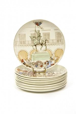 3427. Suite de 11 assiettes à décor de scènes de la vie de Jeanne d'Ar...