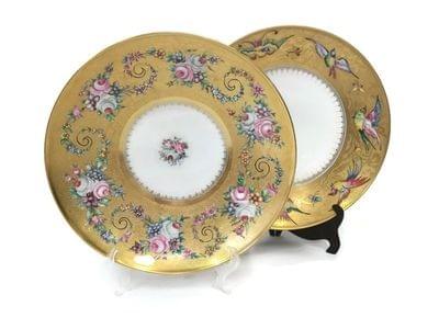 3446. Deux plats à décor en or mat et brillant de rinceaux, fleurs et...