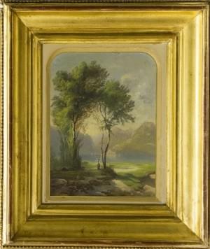 Paysage avec montagnes, huile sur pavatex, signature illisible,...