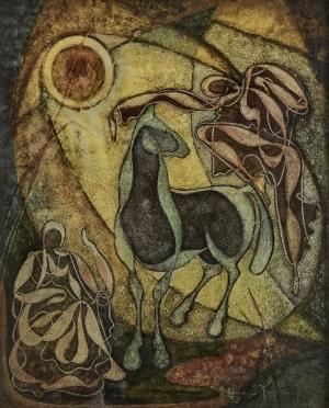 Cheval, peinture sous-verre, signée et datée 58, 35x29 cm