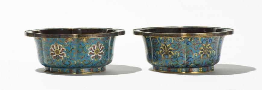 Bronze à décor émaillé cloisonné sur fond turquoise, Chine, H 19...
