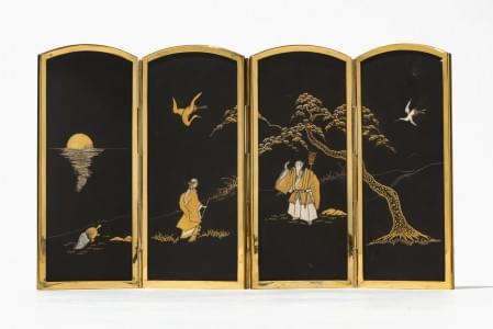 Laque noire et or à décor d'un pêcheur, pipe à décor des signes...