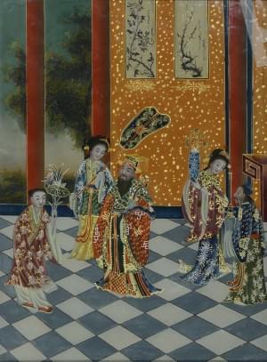 Scène de la cour impériale, sous-verre peint, 56x43 cm