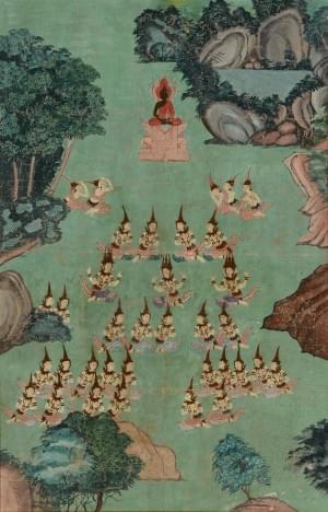 869. Grande peinture sur soie à décor de bouddha et acolytes