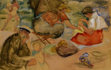 Détente à la plage, aquarelle signée, 32x50 cm