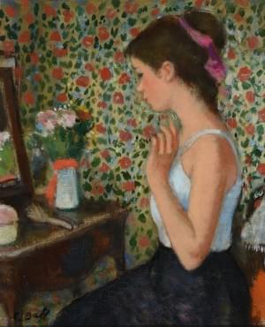 Devant la coiffeuse, huile sur toile signée, 27x22 cm