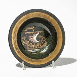 Plat à décor d'une nef, céramique émaillée or et rose sur fond v...