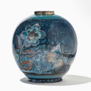 Vase boule papillon et fleurs, céramique émaillée en camaieu ble...