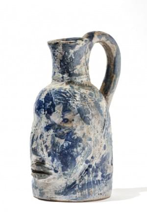 Pichet sculpture à visage humain, céramique émaillée bleu, signé...