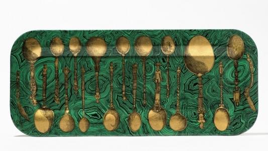 Plateau rectangulaire à décor de cuillères or sur fond vert, 25x...
