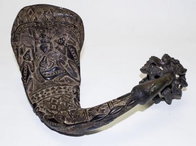 Corne de buffle sculptée de reptiles, coquillages et personnages...