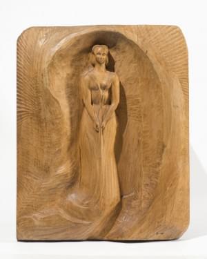 Jeune femme drapée, bas relief en bois naturel, circa 1900, 61x4...