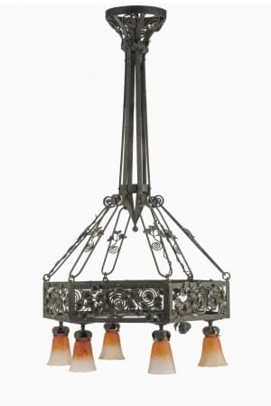 Grand lustre Art déco, six lumières, fer forgé, verre teinté ora...