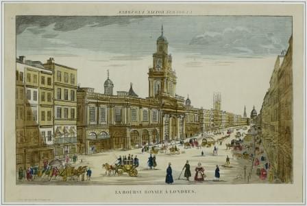 La bourse Royale à Sandres, gravure aquarellée, 27x41cm
