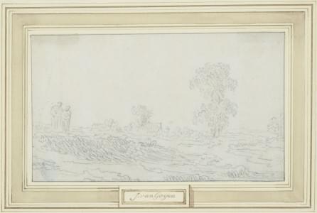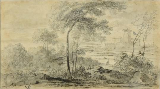Paysage de la campagne romaine, encre et lavis sur papier monogr...