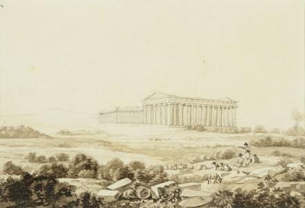 Vue du temple romain de Nîmes et du temple de Paestum en Lucanie...