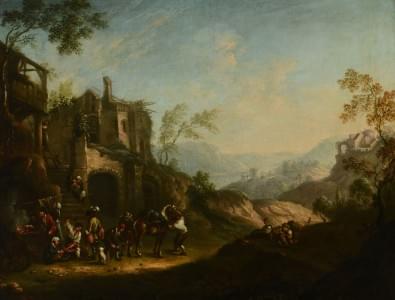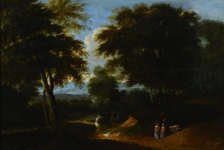 Paysans en chemin, huile sur panneau signée et datée 1732, 37x48...