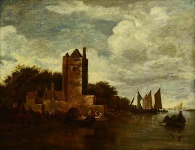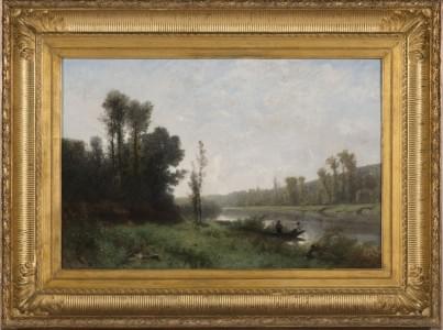 Scène de village au bord du fleuve, huille sur panneau, 44x59,5...