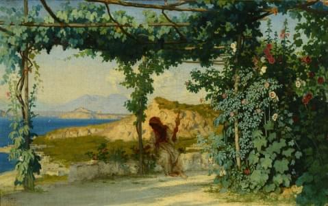 Jeune femme sous la pergola dans la baie de Naples, huile sur to...