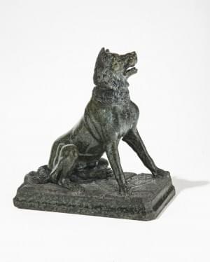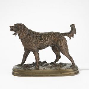 Chien à la laisse, bronze à patine brune, signé, 20x27 cm