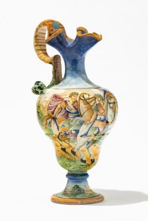 Céramique à décor en camaïeux gris et jaune d'une scène de batai...