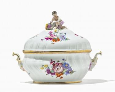 394. Soupière de style rocaille à prise figurant un putto tenant une...