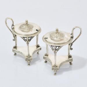 415. Paire de moutardiers d'époque Empire à trois montants sphynge et...