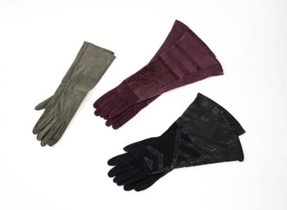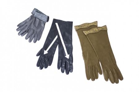 Trois paires de gants longs de couleur noire, grise et bordeau e...
