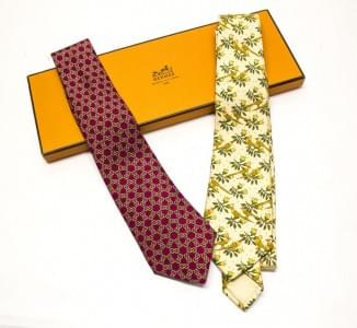 Lot de deux cravates en soie à fond jaune à décor d'oiseau et à...