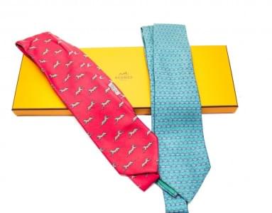 Lot de deux cravates en soie à fond rose à décor de chien et à f...