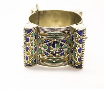 3051. Bracelet manchette africain émaillé de bleu, de vert et de jaune