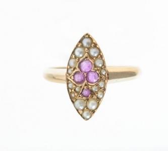 3068. Bague navette sertie de perles et d'un trèfle en rubis
