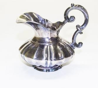 3357. Verseuse piriforme tripode gravée de lambrequins, crémier à larg...