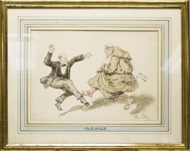 Bourgeois et moine dansant, encre et aquarelle sur papier, signé...