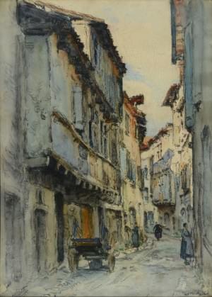 Scène de rue, fusain et aquarelle, signé, 60x44 cm