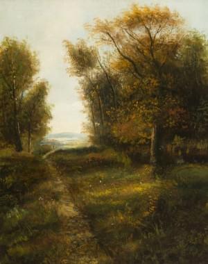 Chemin à l'orée du bois, huile sur toile, cadre en bois stuqué à...