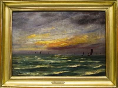 Marine au soleil couchant, huile sur toile, signée, 42x29,5 cm