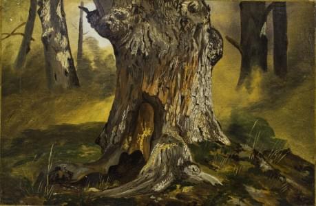 Débit d'un tronc d'arbre, huile sur toile, 27x42 cm