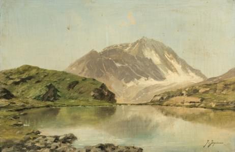 Lac de montagne, huile sur carton signée, 28,5x43 cm