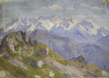 Montagnes au couchant, huile sur carton, signée,11x19 cm