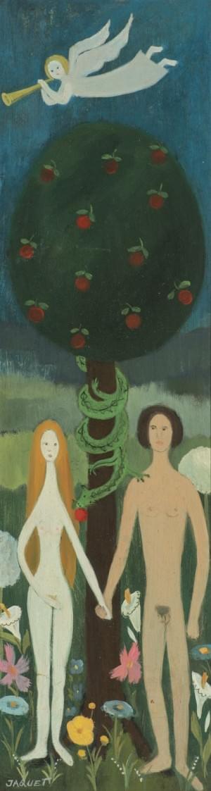 Adam et Eve, huile sur pavatex signée, 60x15,5 cm
