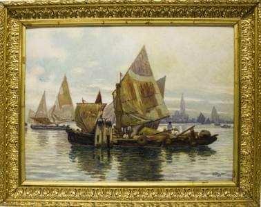 Bateaux de pêcheurs dans la lagune, huile sur carton, signée et...