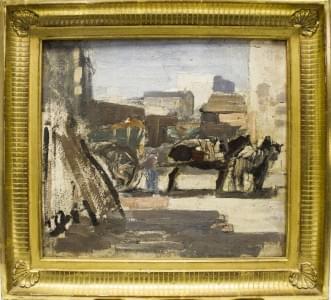 Chevaux attelés à une charrette, huile sur panneau, 31x29 cm
