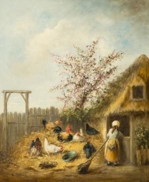 Le poulailler, huile sur toile, signée E. Belina, 55x45 cm