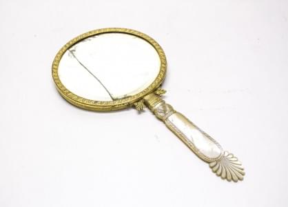 Bronze doré, nacre, sculpté de palmettes, glace au mercure, H 27...