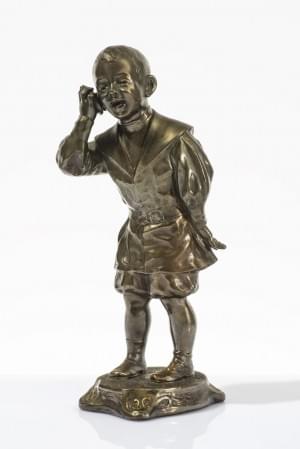 Enfant à la montre, régule à patine lustrée, signée, H 39 cm