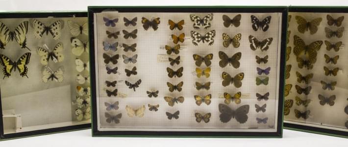 Trois boites d'entomologiste contenant des papillons,