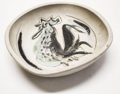 Assiette à décor incisé et émaillé de coq, céramique, signée et...